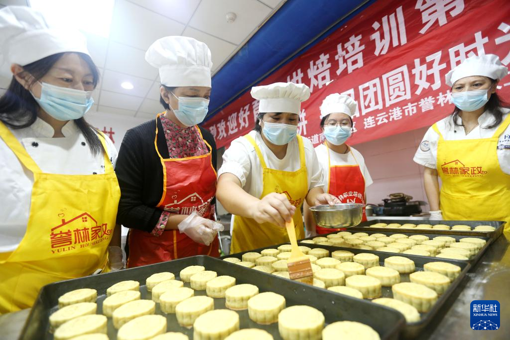 9月25日,在江蘇省連云港市譽林家政培訓機構,連云區墟溝街道南巷社區居民學習制作月餅。
