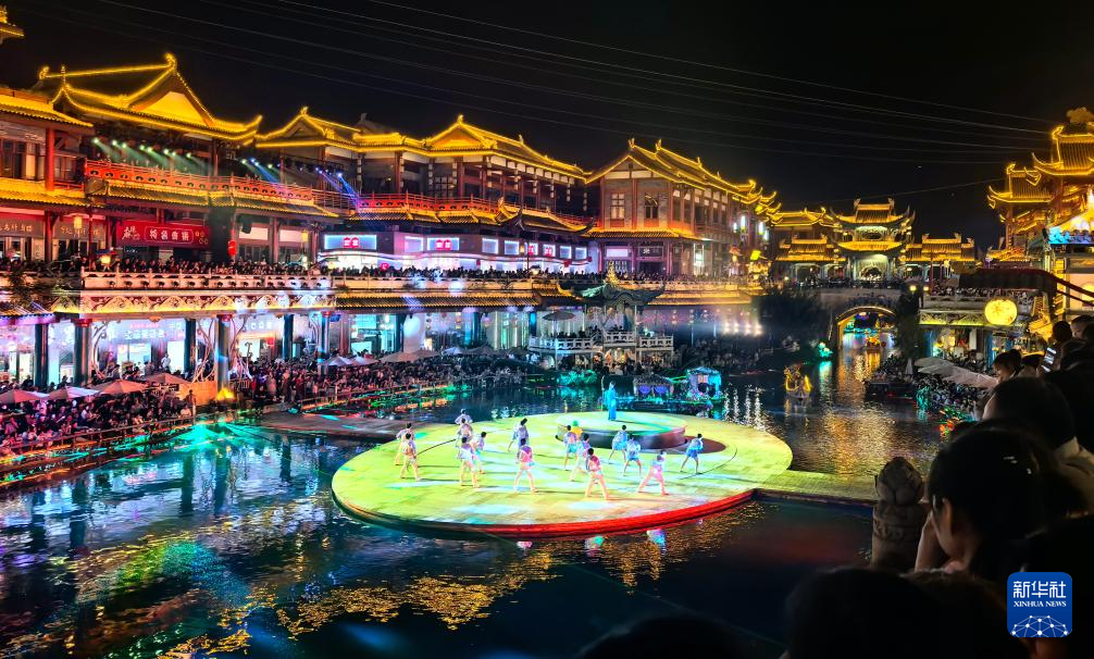 10月1日晚,在四川省眉山市東坡區無憂城水街,游客在觀看演出《東坡奇妙游》。