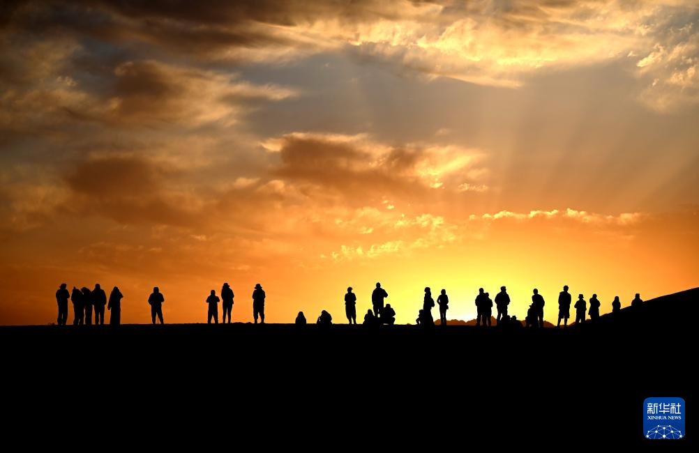10月2日清晨,游客在甘肅省敦煌市鳴沙山月牙泉景區觀賞大漠日出美景。