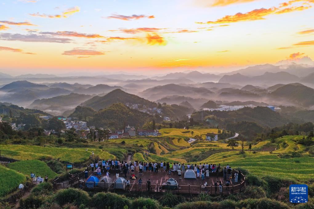 10月4日清晨,游客聚集在浙江省臺州市天臺縣泳溪鄉北山村的鎏金梯田觀景臺拍攝日出(無人機照片)。