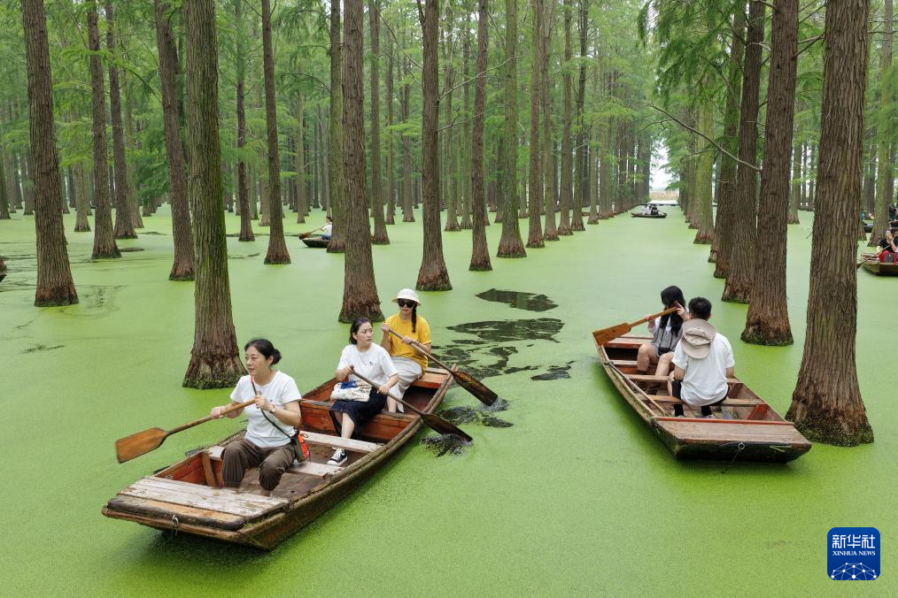 10月5日,游客在江蘇省揚州市淥洋湖濕地公園的“水上森林”乘船游覽(無人機照片)。