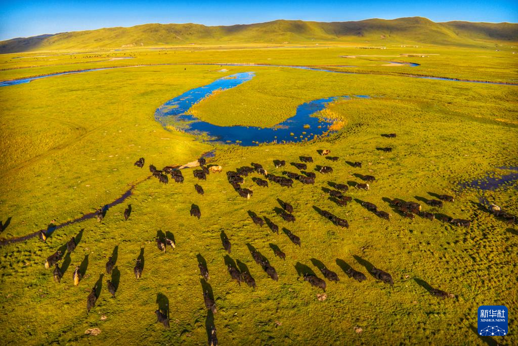 四川阿壩縣,牧民趕著牛群牧歸(無人機照片)。