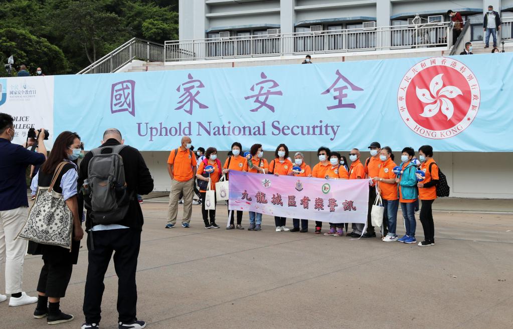 2021年4月15日,在香港警察學院,香港市民在全民國家安全教育日活動上合影留念。新華社記者 李鋼 攝