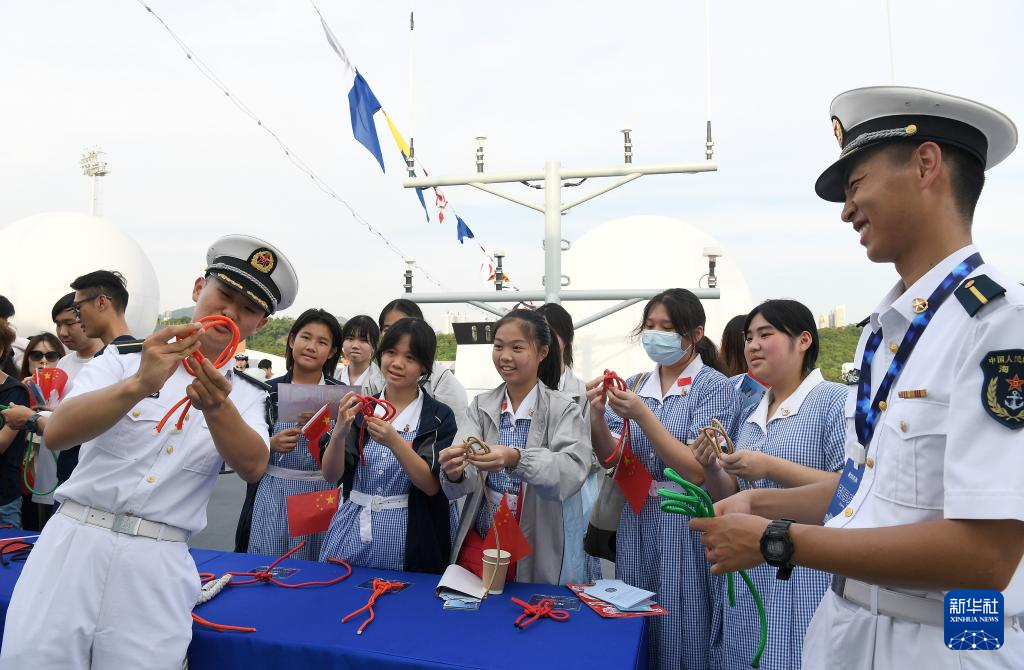 9月30日,參加艦艇開放活動的香港學生在戚繼光艦上學習打繩結。新華社記者 陳鐸 攝