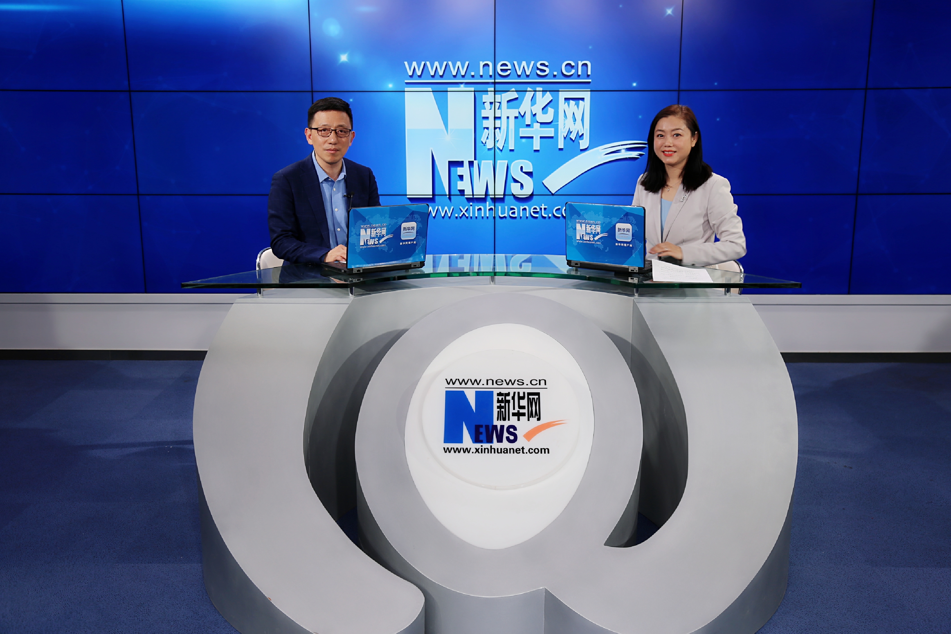 圖為顧均輝(左)做客新華網公益頻道“公益講堂”,就戰略定位落地實操與網友分享。