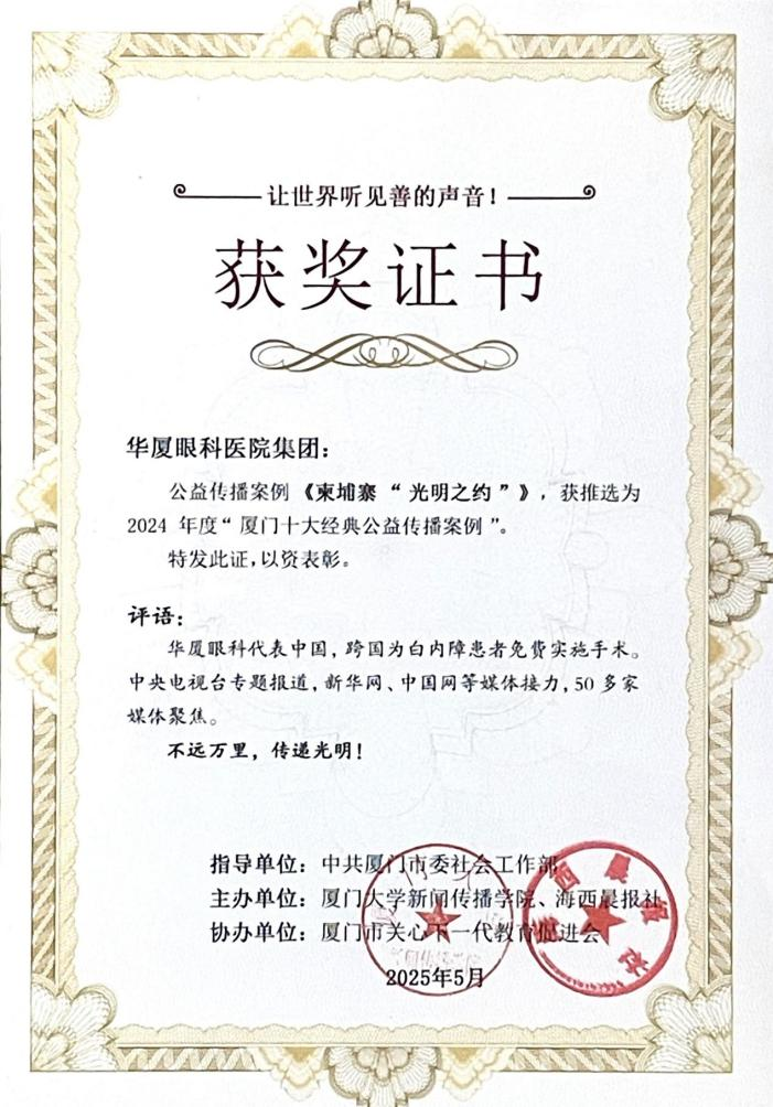 5月30日下午,由中共廈門市委社會工作部指導,廈門大學新聞傳播學院、海西晨報社發起主辦,廈門市關心下一代教育促進會協辦的2024年度“廈門十大經典公益傳播案例”發布儀式在廈門大學科學藝術中心舉行。華廈眼科柬埔寨光明行公益項目,憑借顯著的公益成效以及廣泛的傳播影響力,以第一名的優異成績,獲評2024年度“廈門十大經典公益傳播案例”。