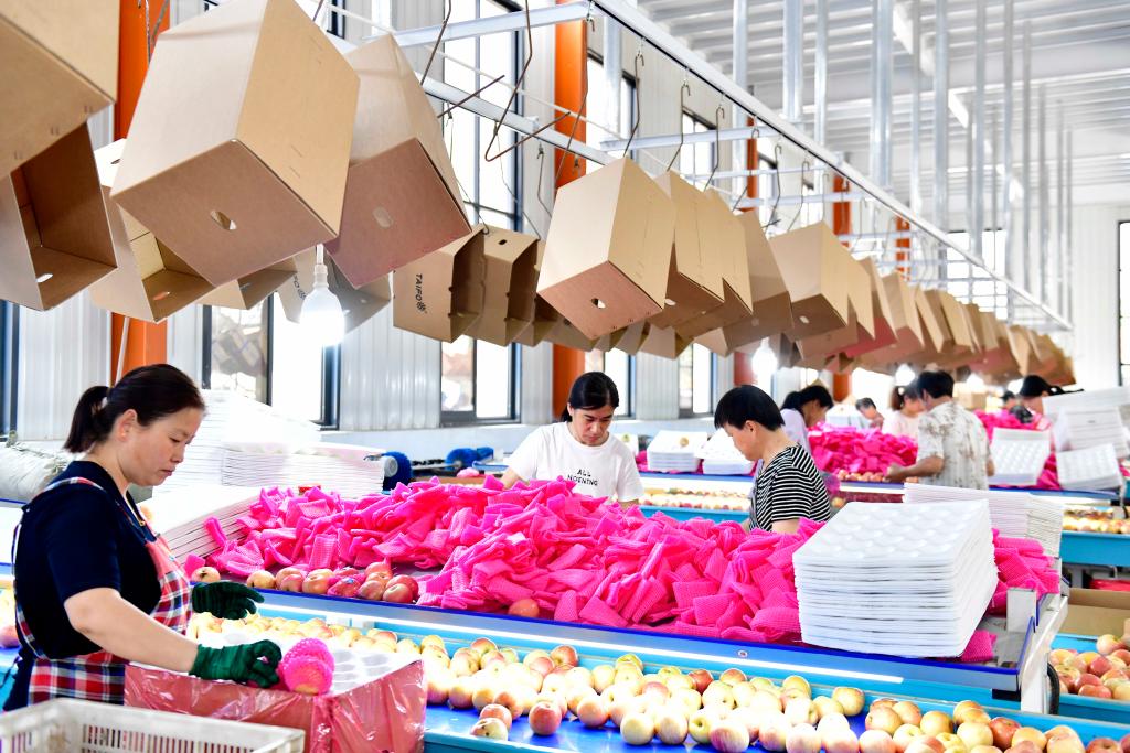 6月26日,工人在惠民縣大年陳鎮一家冷鏈物流公司分揀蘋果。