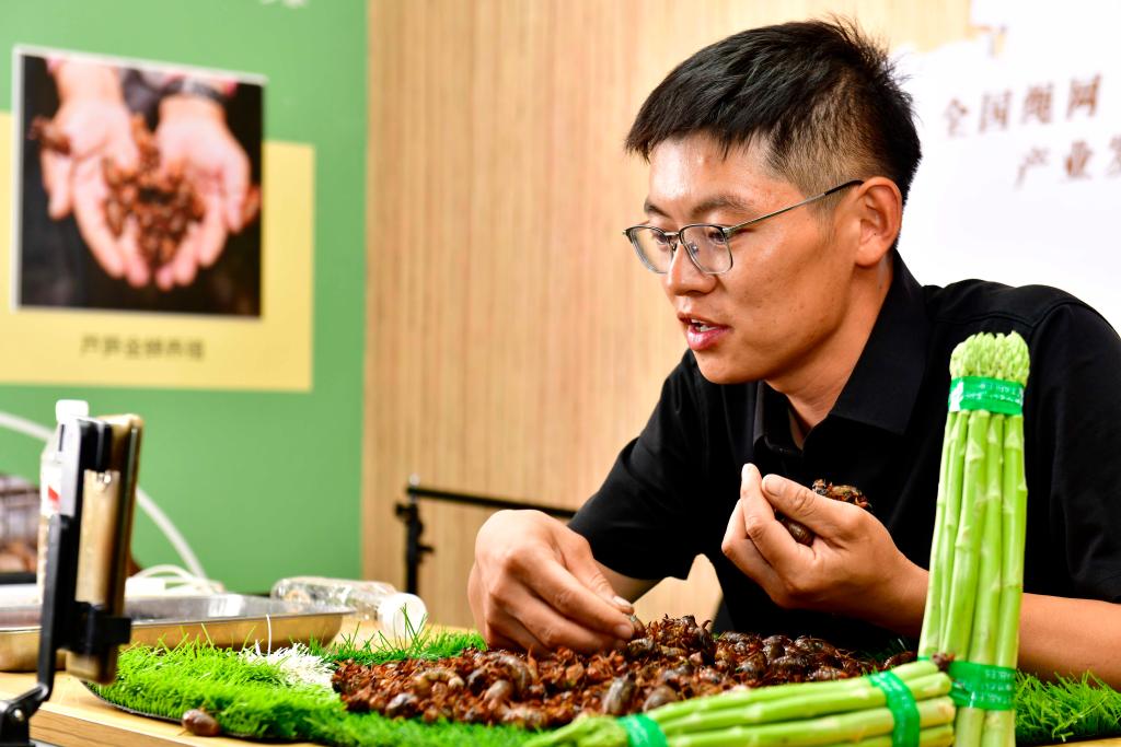 6月26日,網絡主播在惠民縣姜樓鎮共享直播間推介知了猴。