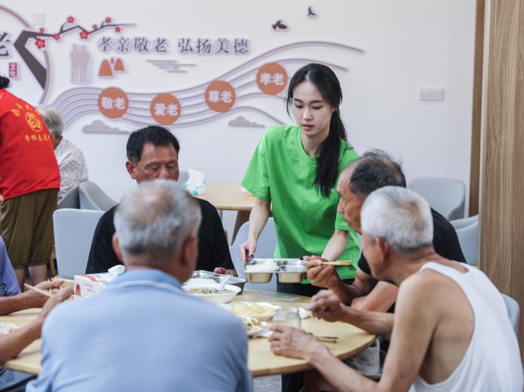7月15日,在諸暨市安華鎮豐江周村愛心食堂,浙江農林大學暨陽學院的學生開展助餐志愿服務。