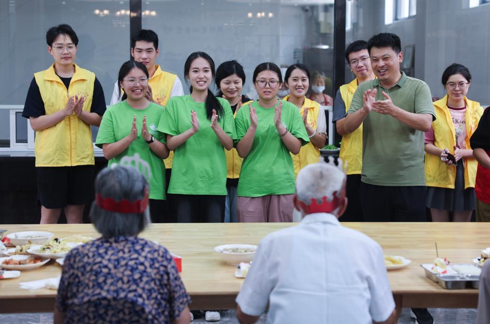 7月15日,在諸暨市安華鎮豐江周村愛心食堂,紹興市文化特派員陳航峰(右二)帶領浙江農林大學暨陽學院的學生們開展志愿服務,為過生日的老人唱生日歌。