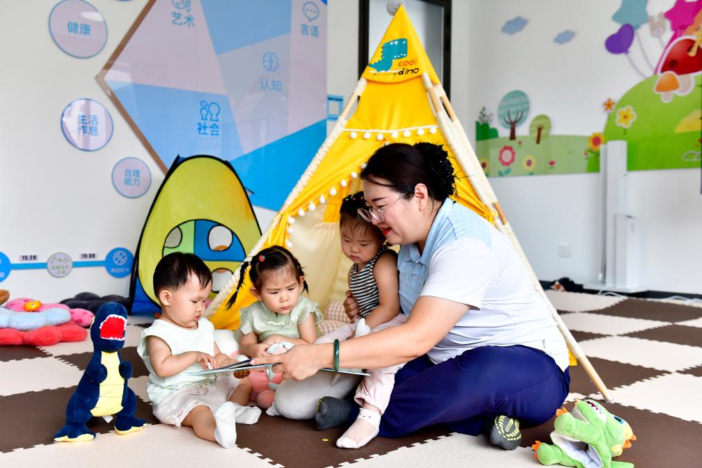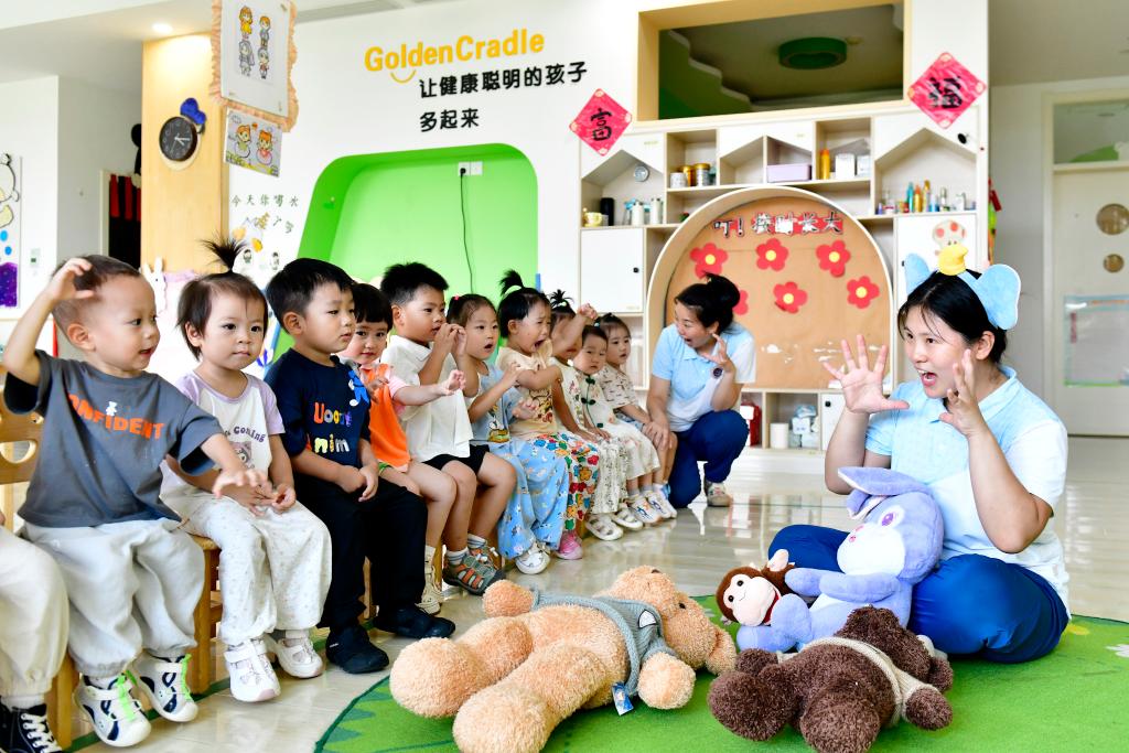 7月22日,在博興縣金色搖籃幼兒園,老師帶托育班的孩子做游戲。