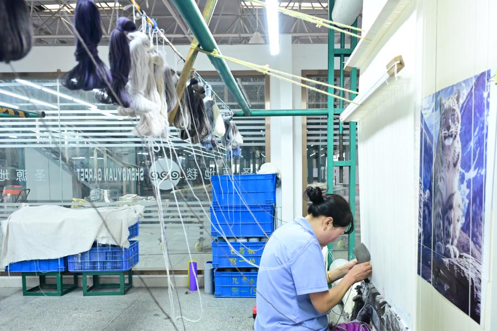“藏毯的原材料是富有青海特色的藏系綿羊毛、牦牛絨等。”杜非介紹,經過升級處理,現在的紗線粗細只有傳統藏毯的八分之一,更精細耐用。公司還研發了近4萬個顏色的色庫,可以讓顏色渲染得更生動自然。