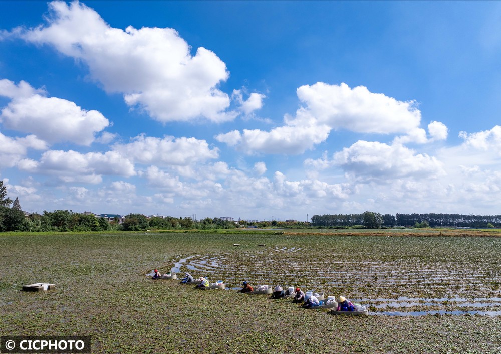 ↑2025年9月23日,江蘇省泰州市海陵區蘇陳鎮張家院社區村民在采摘菱角。(無人機照片)CICPHOTO/湯德宏 攝
