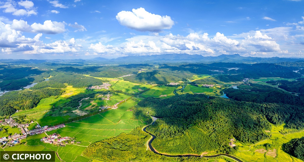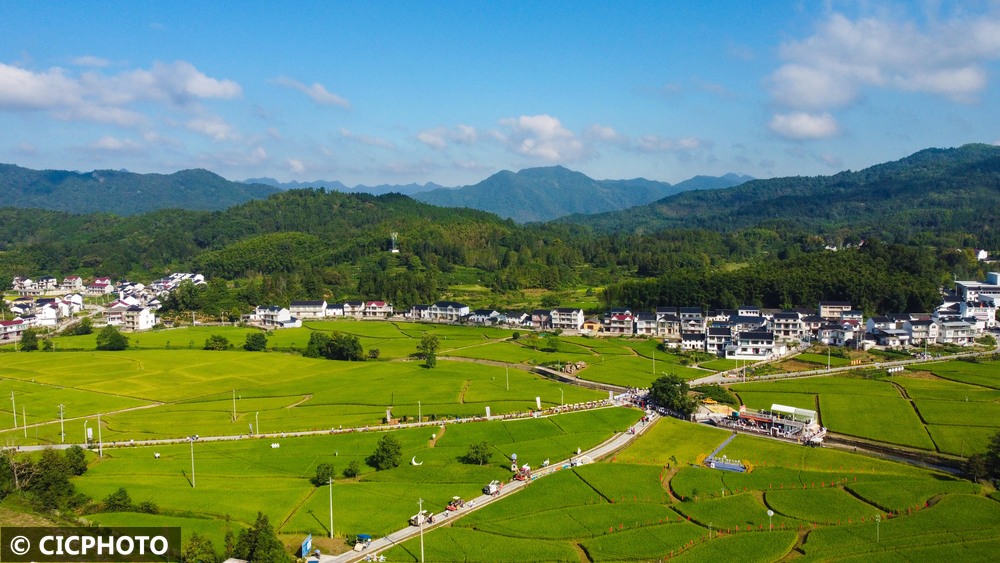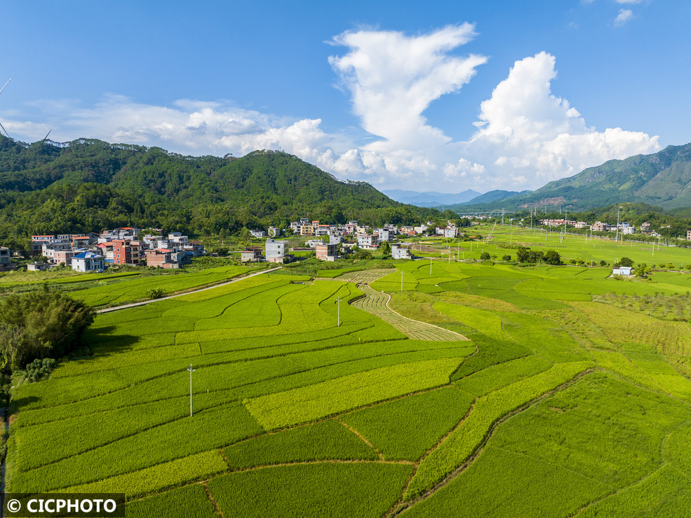 秋高氣爽,各地村莊和田園在藍天白云映襯下景美如畫。
