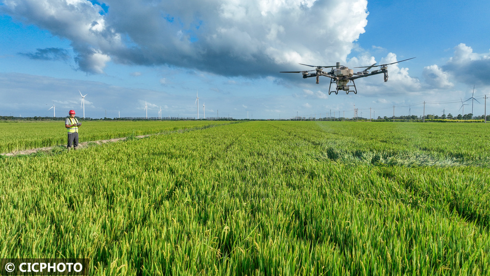 ↑2025年9月22日,在位于江蘇省鹽城市射陽縣的江蘇農墾新洋農場,農技人員操作搭載北斗導航系統的植保無人機在稻田作業。(無人機照片)CICPHOTO/張偉生 攝