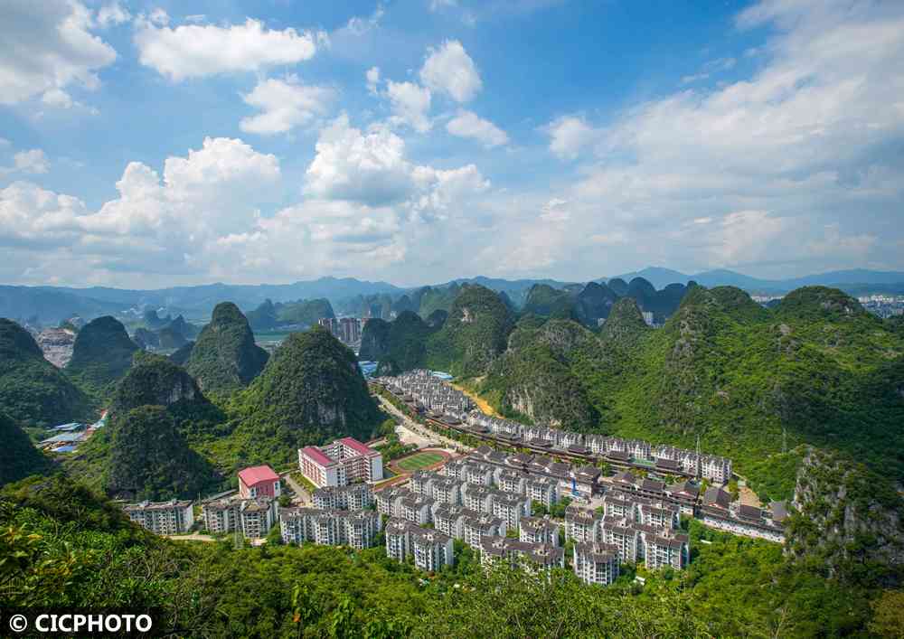 ↑2025年9月18日在廣西柳州市融水苗族自治縣易地扶貧搬遷安置小區苗家小鎮拍攝的景色。CICPHOTO/龍濤 攝