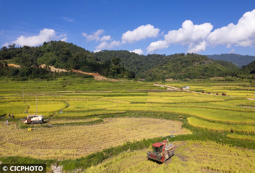 ↑2025年9月17日,農民駕駛收割機在貴州省黔東南苗族侗族自治州從江縣洛香鎮上皮林村收割水稻。(無人機照片)CICPHOTO/梁輝波 攝