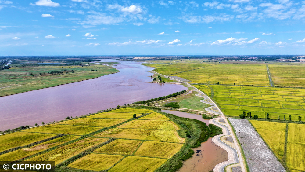 ↑2025年9月17日,寧夏銀川市興慶區月牙湖鄉黃河兩岸的稻田豐收在望。(無人機照片)CICPHOTO/袁宏彥 攝