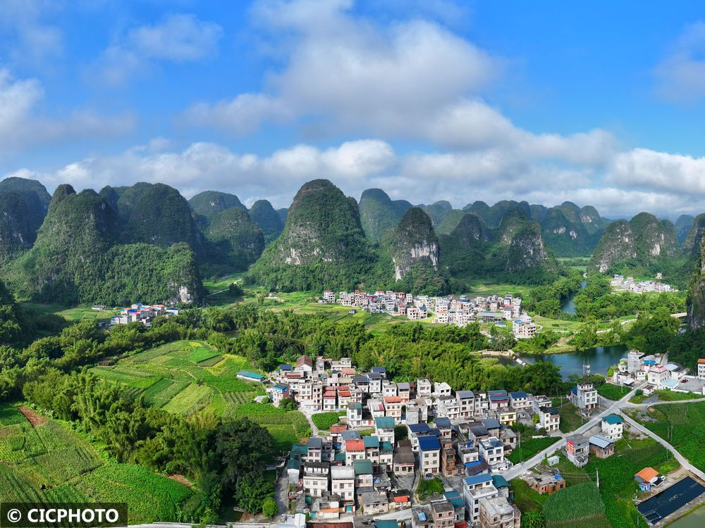 ↑2025年9月18日在廣西河池市羅城仫佬族自治縣小長安鎮羅東村拍攝的景色。(無人機照片)CICPHOTO/韋如代 攝