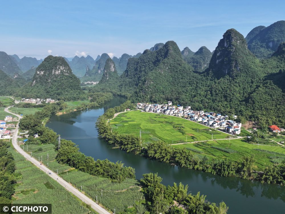 ↑2025年9月28日在廣西河池市羅城仫佬族自治縣懷群鎮泗岸村拍攝的景色。(無人機照片)CICPHOTO/韋如代 攝