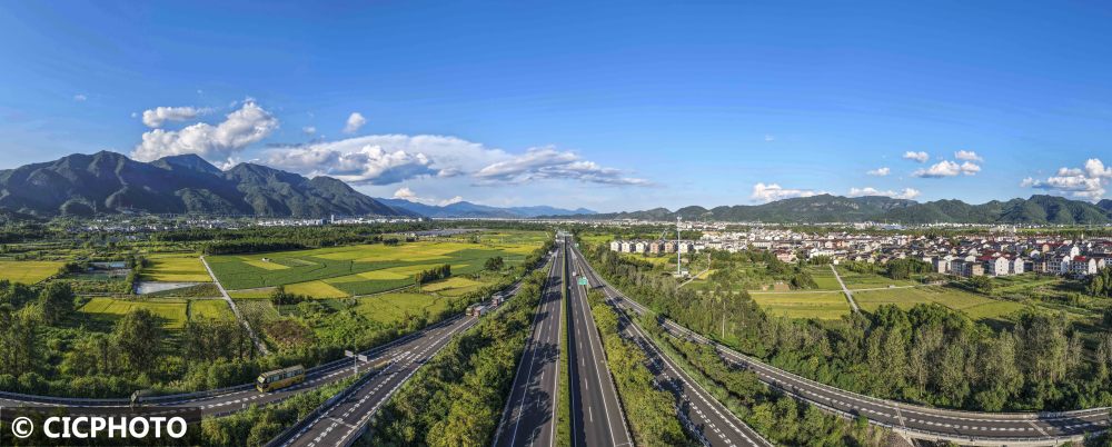↑2025年9月28日,車輛行駛在浙江省臺州市仙居縣白塔鎮境內的高速公路上。(無人機全景照片)CICPHOTO/陳月明 攝