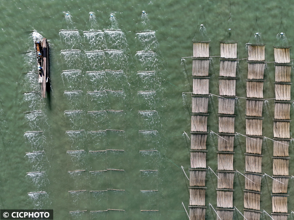 ↑2025年9月27日,在浙江省溫州市樂清灣口“海上田園”,漁民在進行紫菜養殖作業。(無人機照片)CICPHOTO/蔡寬元 攝