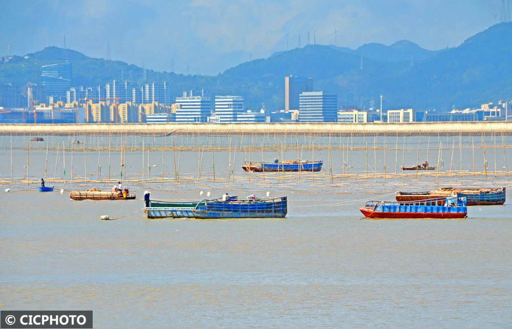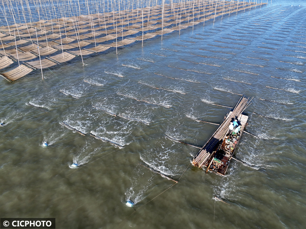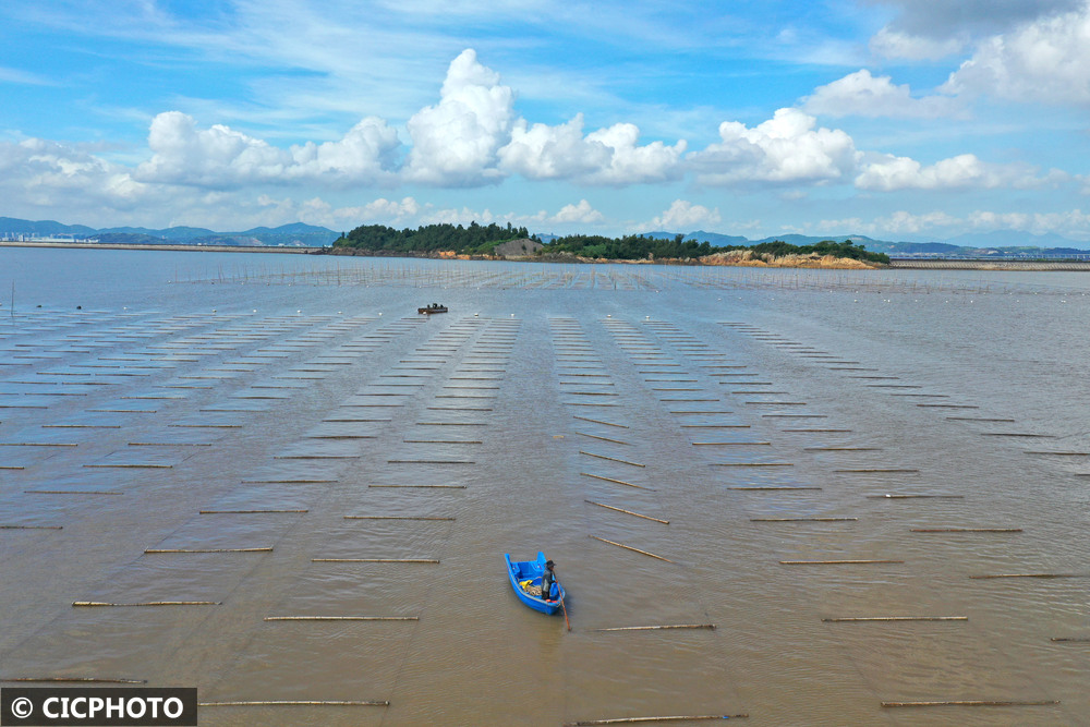 眼下正是紫菜養殖的黃金時期,在浙江省淺海水域,漁民在一排排紫菜養殖架勞作,與藍天、白云、海灣勾勒出一幅“海上田園”的生態畫卷。