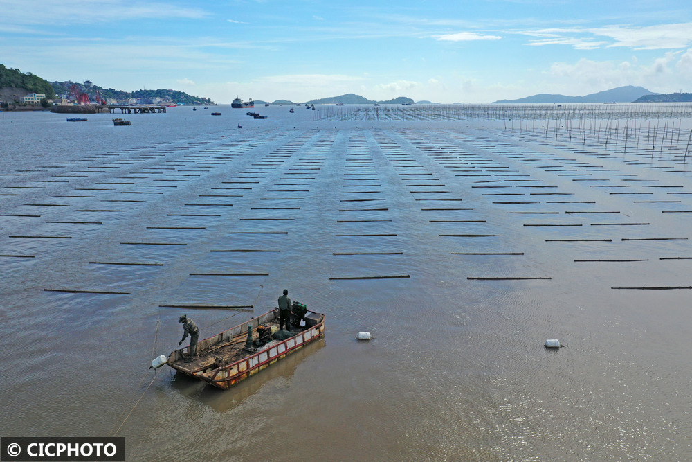 ↑2025年9月27日,浙江省玉環市干江鎮下礁門淺海水域“海上菜園”,養殖戶忙著養殖紫菜。CICPHOTO/段俊利 攝
