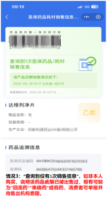 情況3:“查詢到僅有1次銷售信息”,如非本人購買,說明該藥品此前已被出售過,極有可能為“回流藥”“串換藥”或假藥,消費者可舉報并向售出機構索賠。