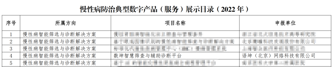 近日,在國家衛生健康委規劃發展與信息化司、工業和信息化部電子信息司的指導和支持下,由中國疾控中心慢病中心和中國信息通信研究院聯合主辦的首批慢性病防治典型數字產品與服務征集和遴選活動公布了入選名單。數坤智慧篩查和輔助診斷平臺作為優秀項目,榮譽入選“慢性病防治典型數字產品(服務)展示目錄(2022 年)”。