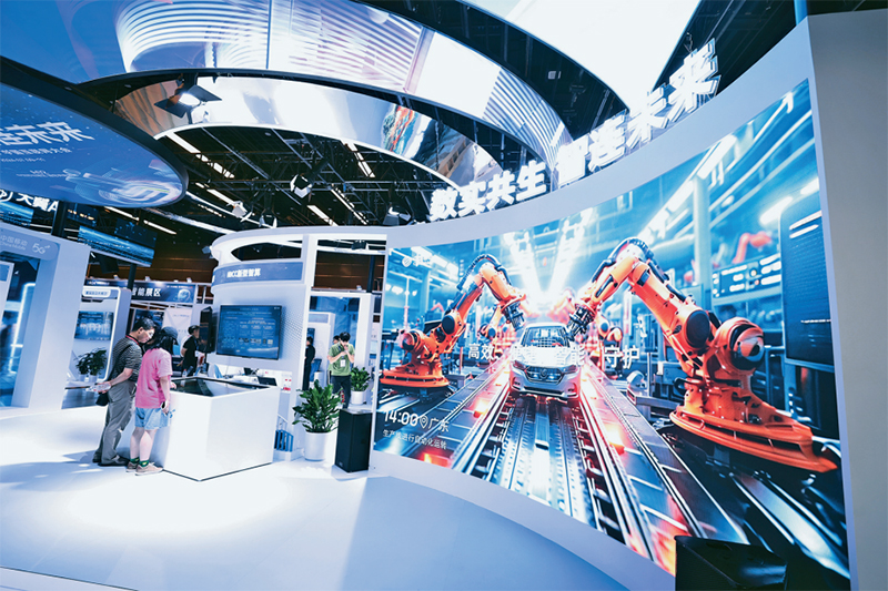 我國既是制造大國也是網絡大國,發展工業互聯網具有獨特優勢和廣闊前景。圖為2024年5月19日,基于海爾集團卡奧斯工業互聯網平臺打造的元宇宙未來工廠(海爾上海洗衣機互聯工廠),實體產線與虛擬產線同步運行,生產人員通過數字孿生大屏監測和控制實體產線運行,開展生產調度、故障診斷等工作。 中國工業互聯網研究院供圖