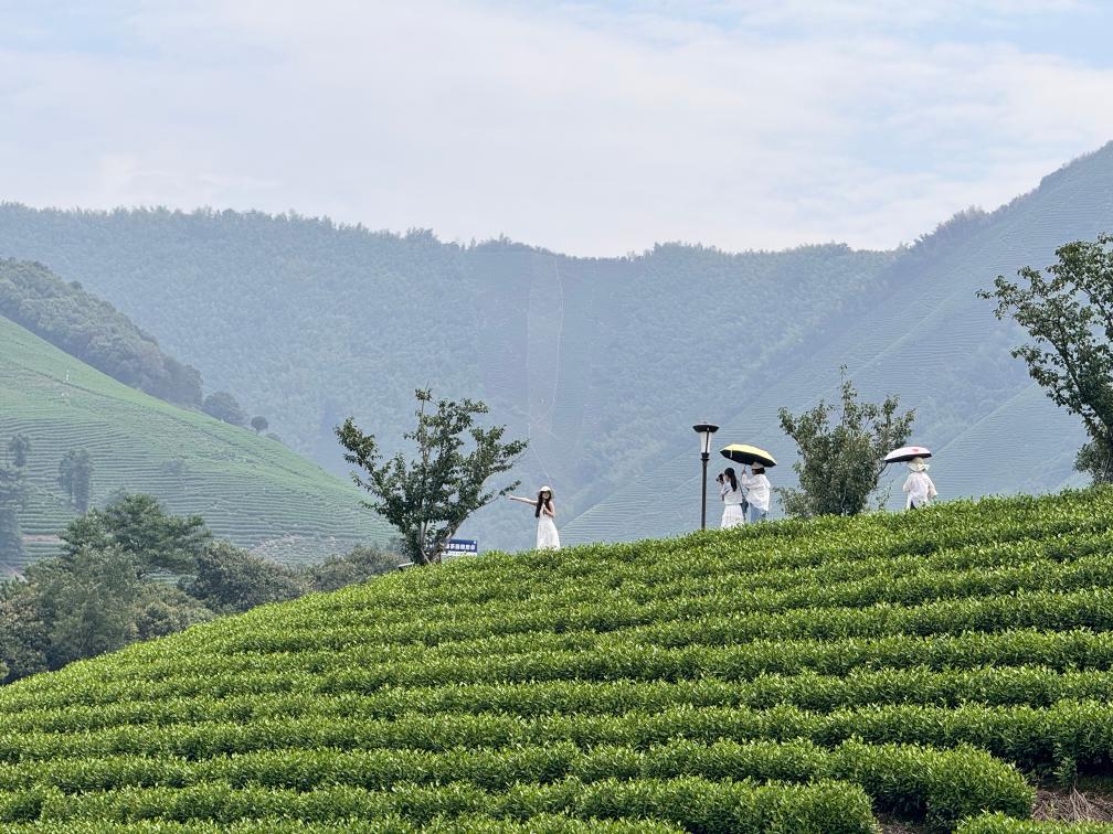 游客在浙江安吉黃杜村萬畝茶園內拍照打卡。新華社記者鄭可意 攝
