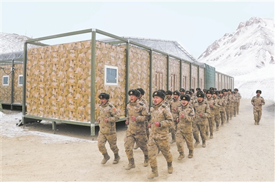 ????冰天雪地里,一棟棟新營房格外引人注目。連續駐守高原邊防10年的某邊防連干部吉根高興地說:“這些新型營房既嚴整規范又功能先進,配套保障設施齊全,現在盡管室外夜間寒風刺骨,但室內可以保持在15℃以上。”野戰保溫方艙更受歡迎,官兵們反映,這種專門為邊防官兵配發的新型拆裝式自供能保溫方艙適用實用,可保障官兵在高寒高海拔地區安營扎寨、執行任務。