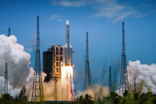 ????我國在海南島東北海岸中國文昌航天發射場,用長征五號遙四運載火箭將我國首次火星探測任務“天問一號”探測器發射升空(7月23日)。新華社發(郭文彬 攝)