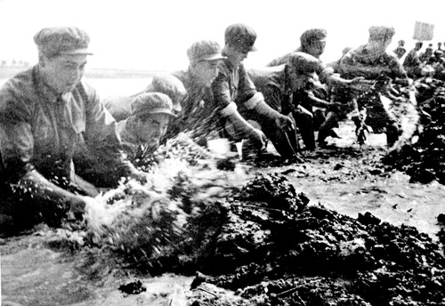 ????西昌衛星發射中心西昌發射場建設初期,老一輩航天人在安寧河中搶建長征橋(資料圖片)。新華社發