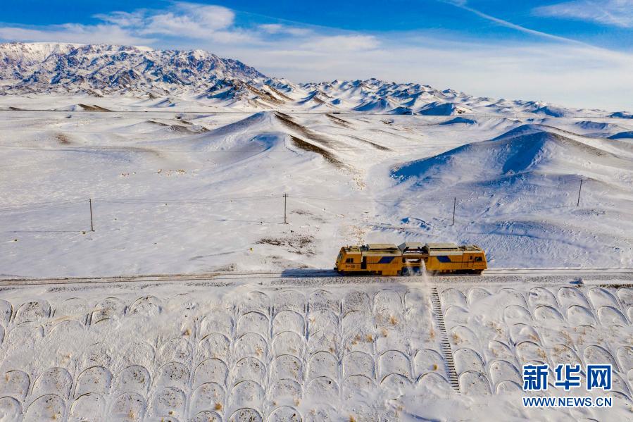 軌道除雪車在瑪依塔斯風區克塔鐵路沿線進行清雪作業(1月21日攝,無人機照片)。新華社記者 胡虎虎 攝