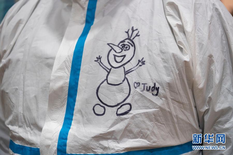 1月23日,在哈爾濱市兆麟社區核酸檢測點,一位在值守的工作人員因為值班幾天沒有回家,想念女兒,就在防護服上畫了女兒喜歡的卡通形象,寫上了女兒的名字。新華社記者 謝劍飛 攝