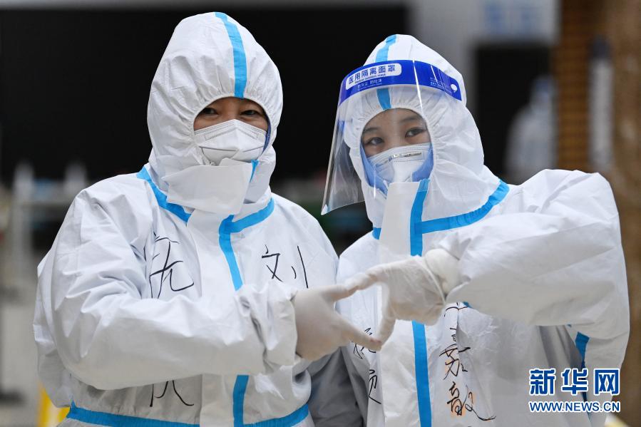 1月23日,兩名醫護人員在哈爾濱市撫順社區核酸檢測點“比心”合影。新華社記者 王建威 攝