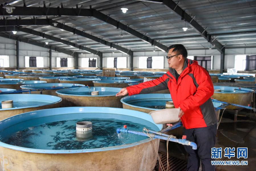 在伊河鱘業科技股份有限公司養殖基地,工人在給鱘魚魚苗喂食(2月7日攝)。