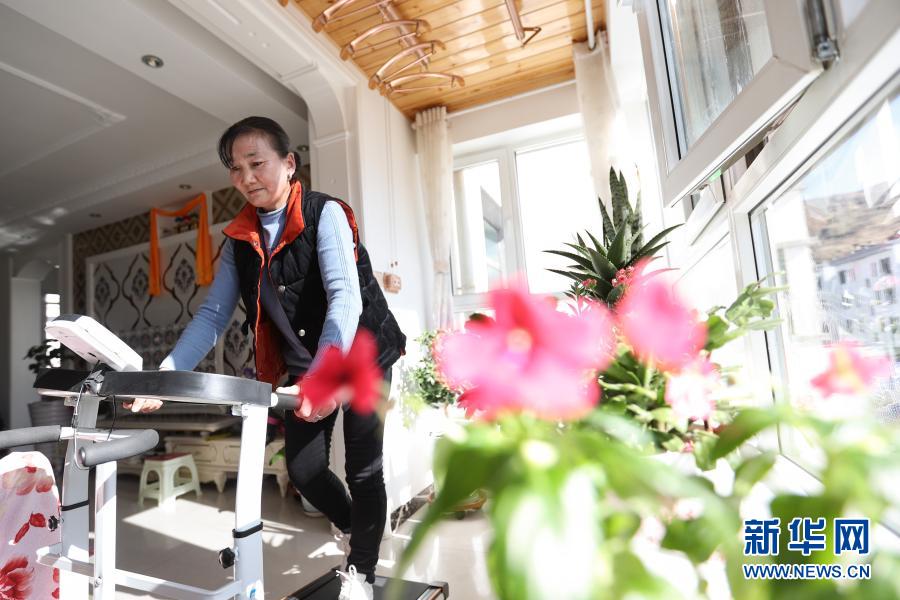 2月5日,在青海省海東市平安區三合鎮的易地搬遷集中安置區,翻身村村民牟落毛吉在家中的跑步機上鍛煉身體。