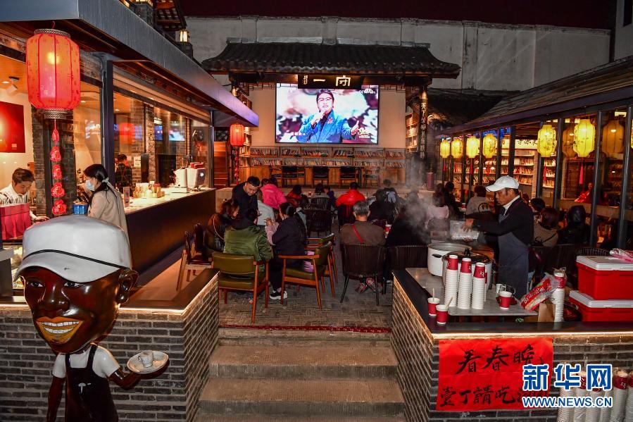 除夕夜,成都寬窄巷子景區內的壹丁24小時書吧咖啡館響應“就地過年”倡議,推出“來寬窄吃團圓飯看春晚”活動。上百名市民、游客圍坐在古樸的寬窄巷子院壩里,享受露天看春節聯歡晚會的樂趣。壹丁24小時書吧咖啡館的創始人還準備了餃子、湯圓請游客免費品嘗,成為一道別樣的年夜飯。