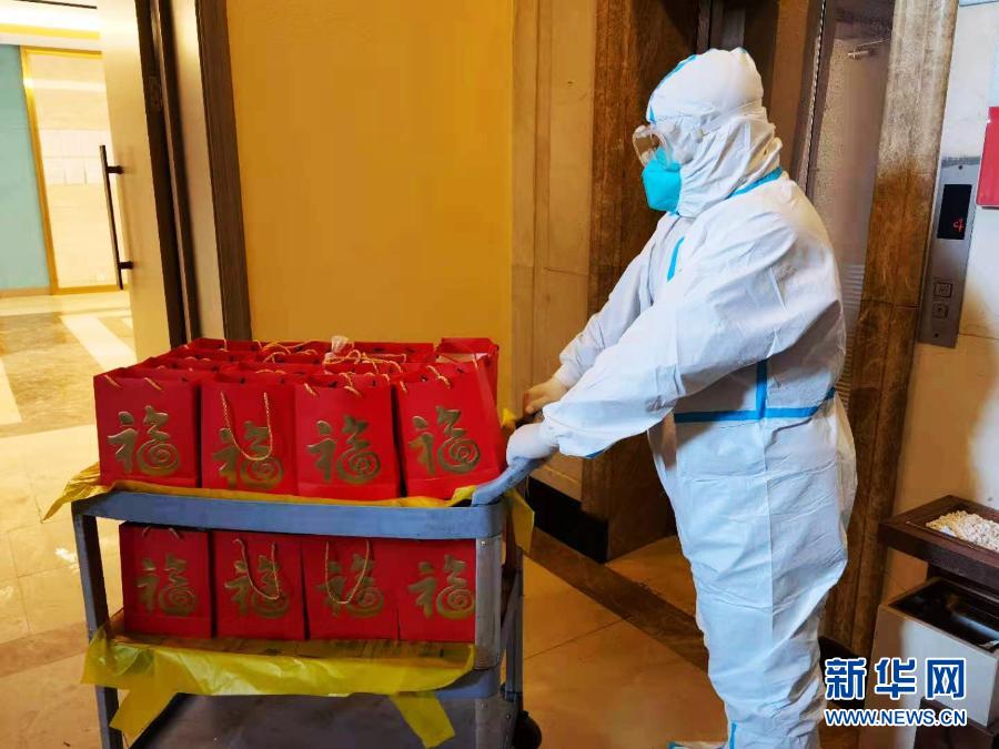 2月11日,在沈陽市鐵西區一處隔離安置點,馬會昌為每位隔離安置人員送去裝有花生、瓜子、榛子等年貨的“新春大禮包”。新華社發