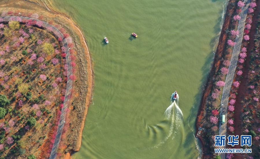 2月14日,游客在湖南省常寧市羅橋鎮櫻花園游玩 (無人機照片) 。新華社發(曹正平 攝)