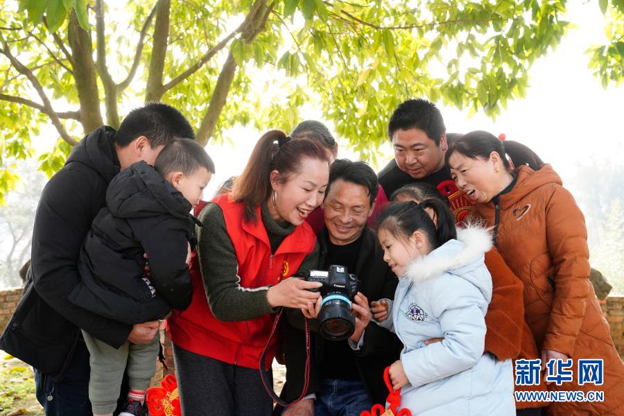 2月14日,在重慶市北碚區金刀峽鎮小華鎣村,志愿者在和村民一起觀看相機里的照片。