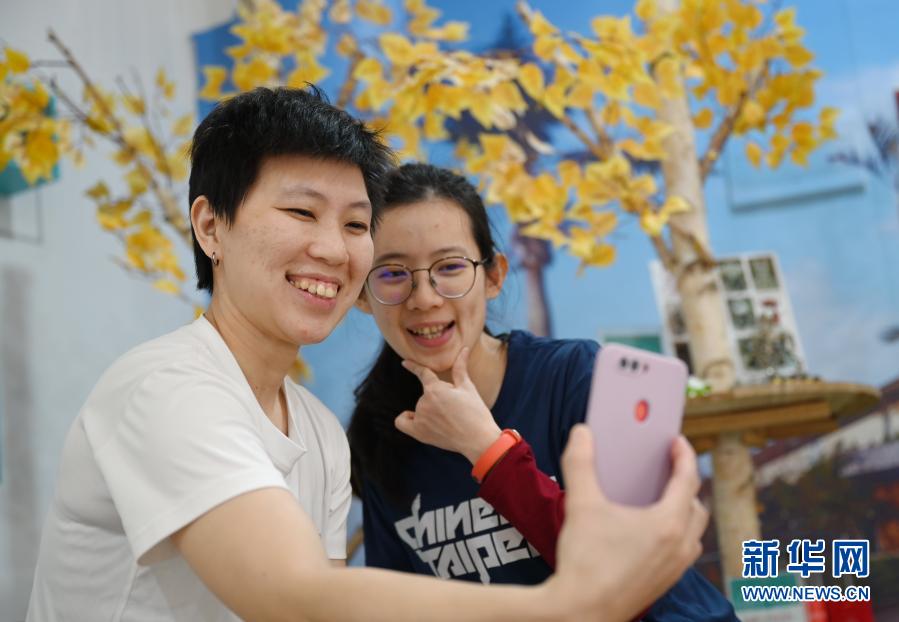 2月15日,陳燕亭(左)和伙伴張雅雯在跆拳道館通過手機向在臺灣的親人問候。新華社記者 林善傳 攝