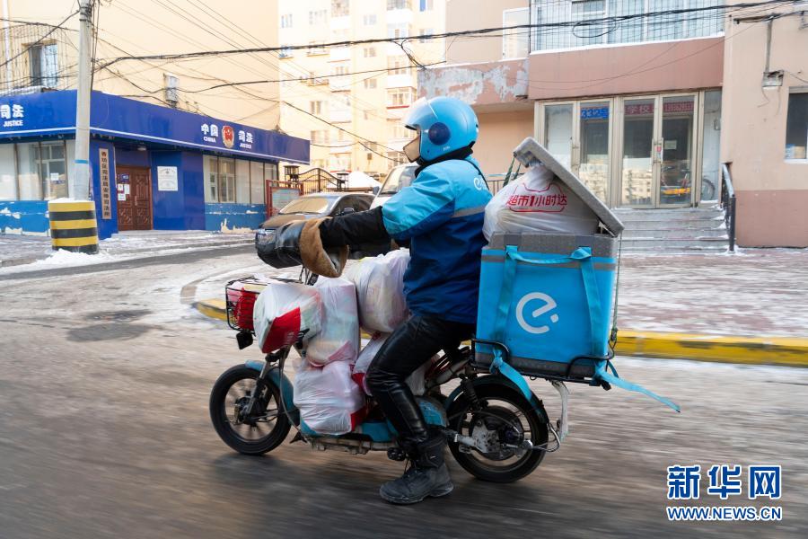 2月4日,在哈爾濱市香坊區,劉剛在配送商品。新華社記者 謝劍飛 攝