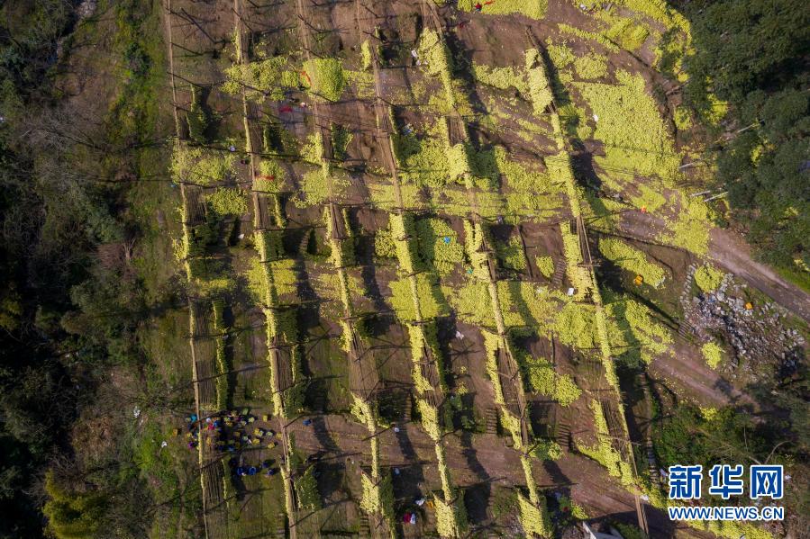 2月20日,在重慶市涪陵區馬武鎮一家榨菜企業的晾曬場上,成串的青菜頭在進行晾曬(無人機照片)。新華社記者 劉潺 攝