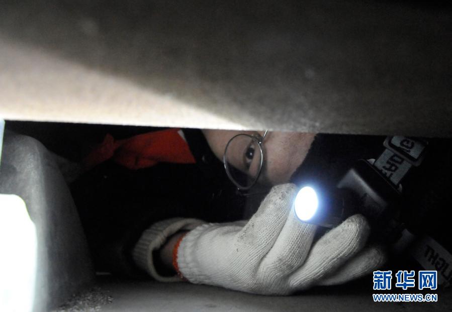 2月21日,鐵路工人趴在鐵軌上查看墊板。
