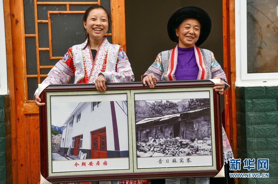 2月20日,在化屋村麻窩寨易地扶貧搬遷集中安置點,苗族女孩王代玉(左)與母親楊文梅在自家新房前展示易地扶貧搬遷前后的對比照片。王代玉在北京市石景山區從事餐飲業已八年,今年春節回家后她打算留在家里發展手工刺繡,分擔家庭負擔。