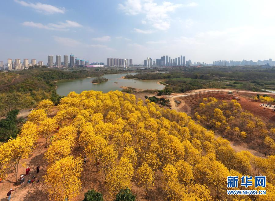 這是南寧市青秀山風景區盛開的黃花風鈴木(2月21日攝,無人機照片)。